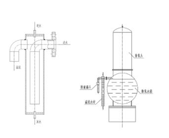 (3)當(dāng)除氧器內(nèi)的蒸汽過多而使除氧器內(nèi)部壓力超過正常工作壓力時(shí),多余的蒸汽可以通過溢流裝置排出,使除氧器泄壓,防止除氧器因超壓發(fā)生危險(xiǎn)。溢流水封裝置結(jié)構(gòu)及安裝圖如圖